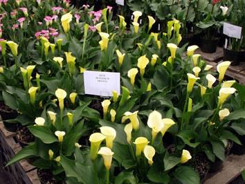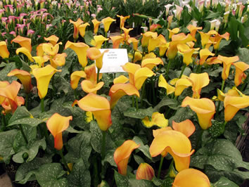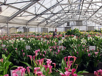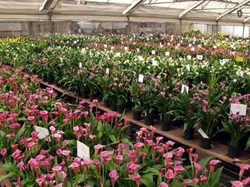 Thousands of pots of different sizes with more than fifty varieties of callafornia Callas® are made according to the cultural recommendations of the Golden State bulb manufacturers. Different combinations of tubers and pot sizes have been demonstrated to help producers determine the optimal yield for different target markets. Also shown is the production of cut flowers, as well as various other products offered. |